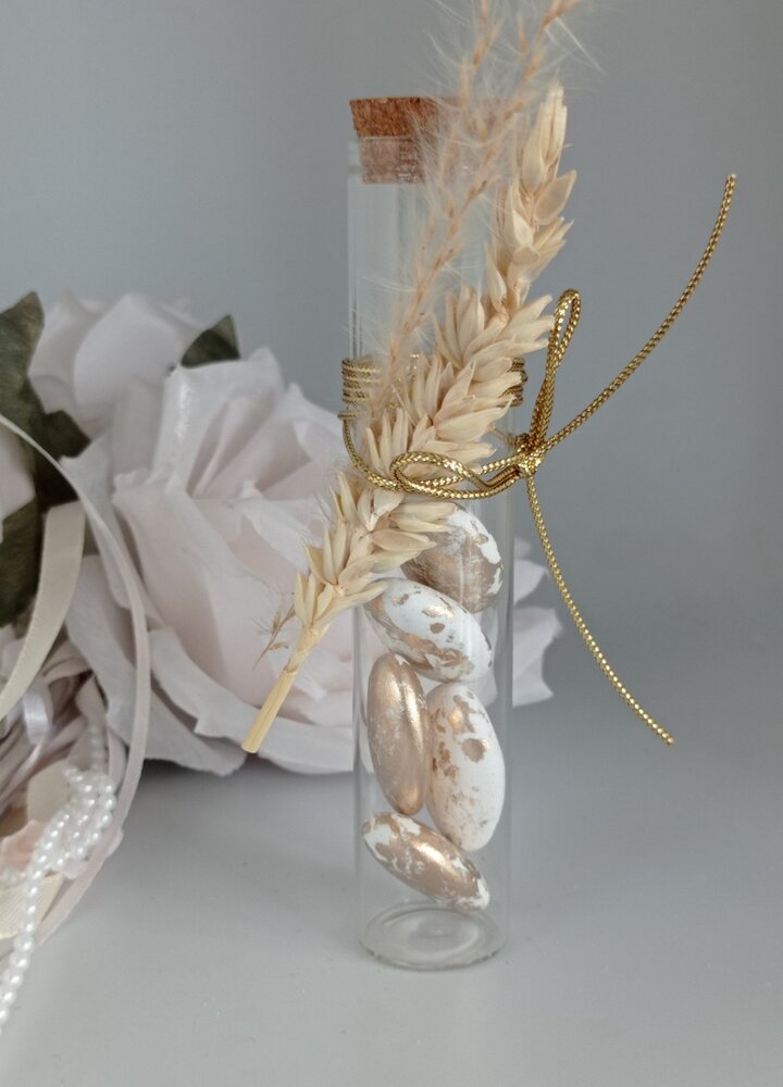 Μπομπονιέρα γάμου, Γυάλινος σωλήνα με πέντε κουφέτα με γεύσεις πλακέ χρυσά. ποσότητα