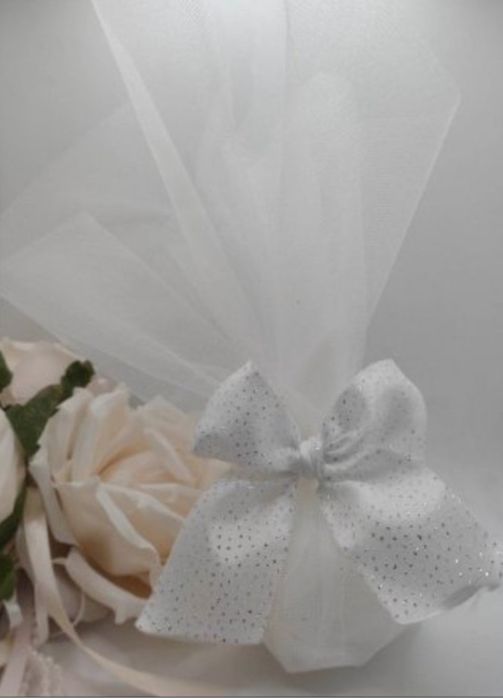 Μπομπονιέρα γάμου, πουγκί με διπλό τούλι και πέντε κουφέτα