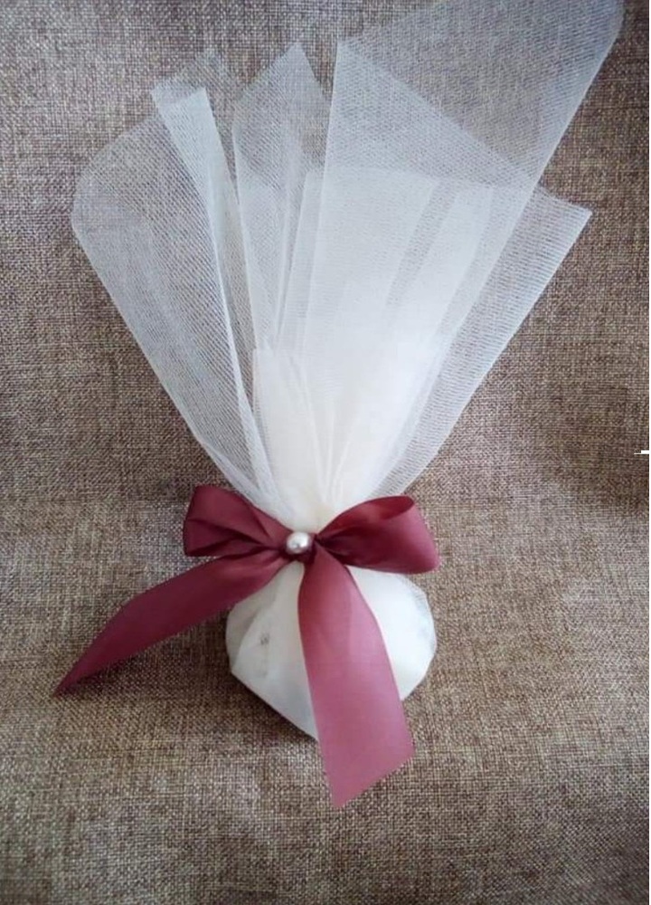Μπομπονιέρα γάμου, πουγκί τούλι και πέντε κουφέτα
