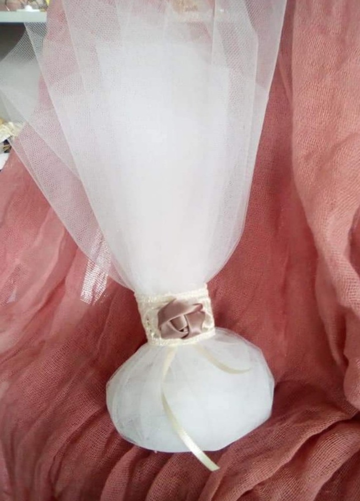Μπομπονιέρα γάμου, πουγκί τούλι και πέντε κουφέτα